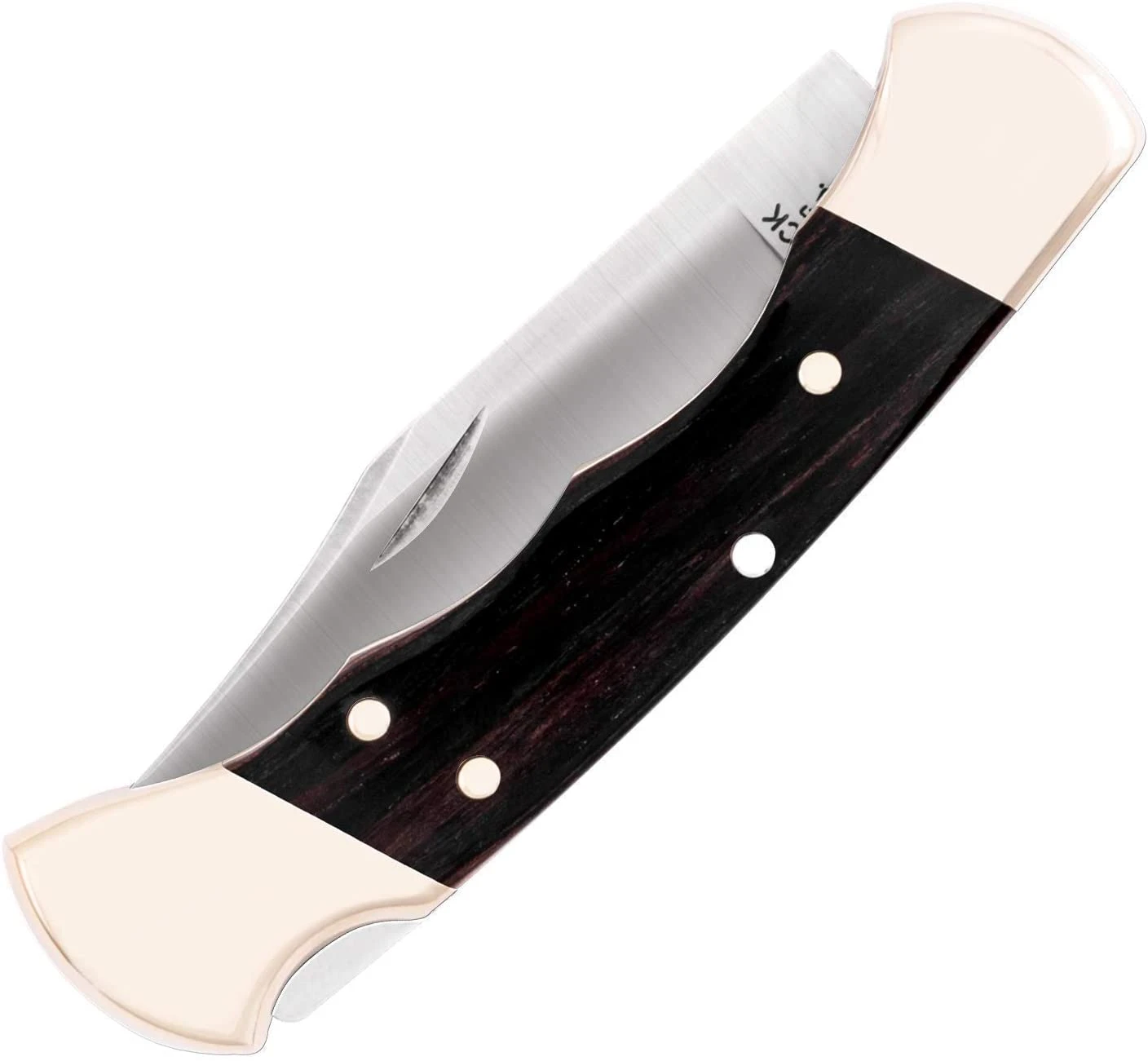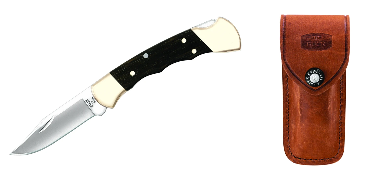 Buck Knives 112 Ranger Finger Groove Genuine Ebony Wood Folding Knife W/ Upgraded Suede Leather Sheath