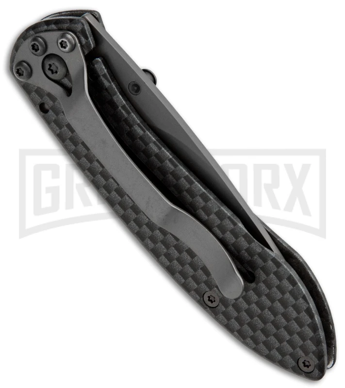 Contemporary, slimline, one-hand deployment folding knife with titanium coated blade and carbon fiber graphic on handle for added corrosion resistance.